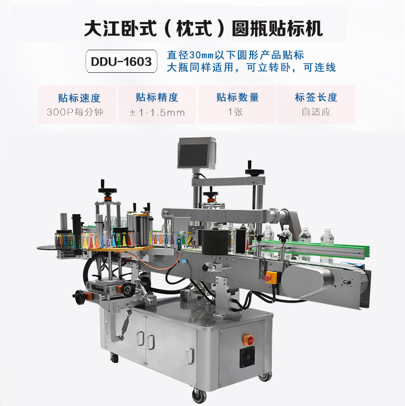 DDU-1603 立式圓瓶定位貼標(biāo)機(jī) 適用范圍:用途廣泛!主要適用于醫(yī)藥、日化、食品等行業(yè)的圓柱形包裝容器或小錐度的圓錐形包裝容器的單標(biāo)、雙標(biāo)自動定位貼標(biāo).該機(jī)拓展性強(qiáng)!可選配各類打印機(jī)完成在線實(shí)時打印,可單機(jī)使用,亦能連接生產(chǎn)線使用 主要性能結(jié)構(gòu)特點(diǎn):1、中英文觸…